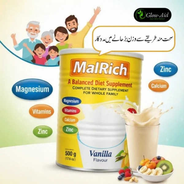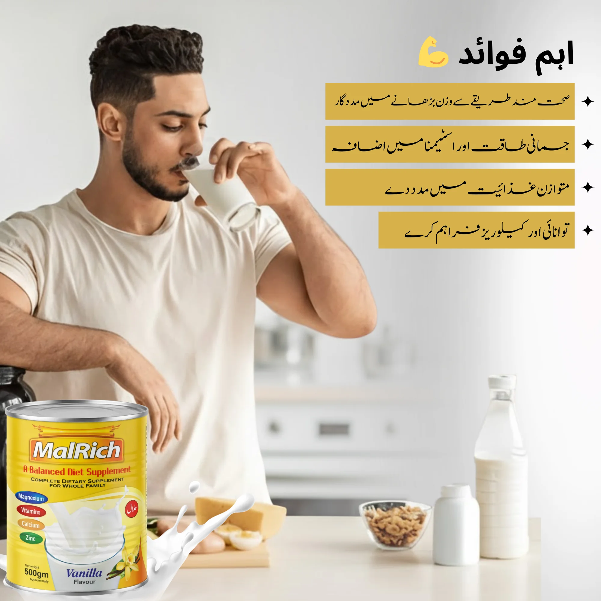 Malrich Healthy Weight Gain Milk Powder is a premium nutritional supplement designed to support healthy weight gain, muscle growth, and overall wellness. Enriched with proteins, vitamins, and minerals, it provides the essential calories and nutrients needed to achieve optimal body mass and strength.